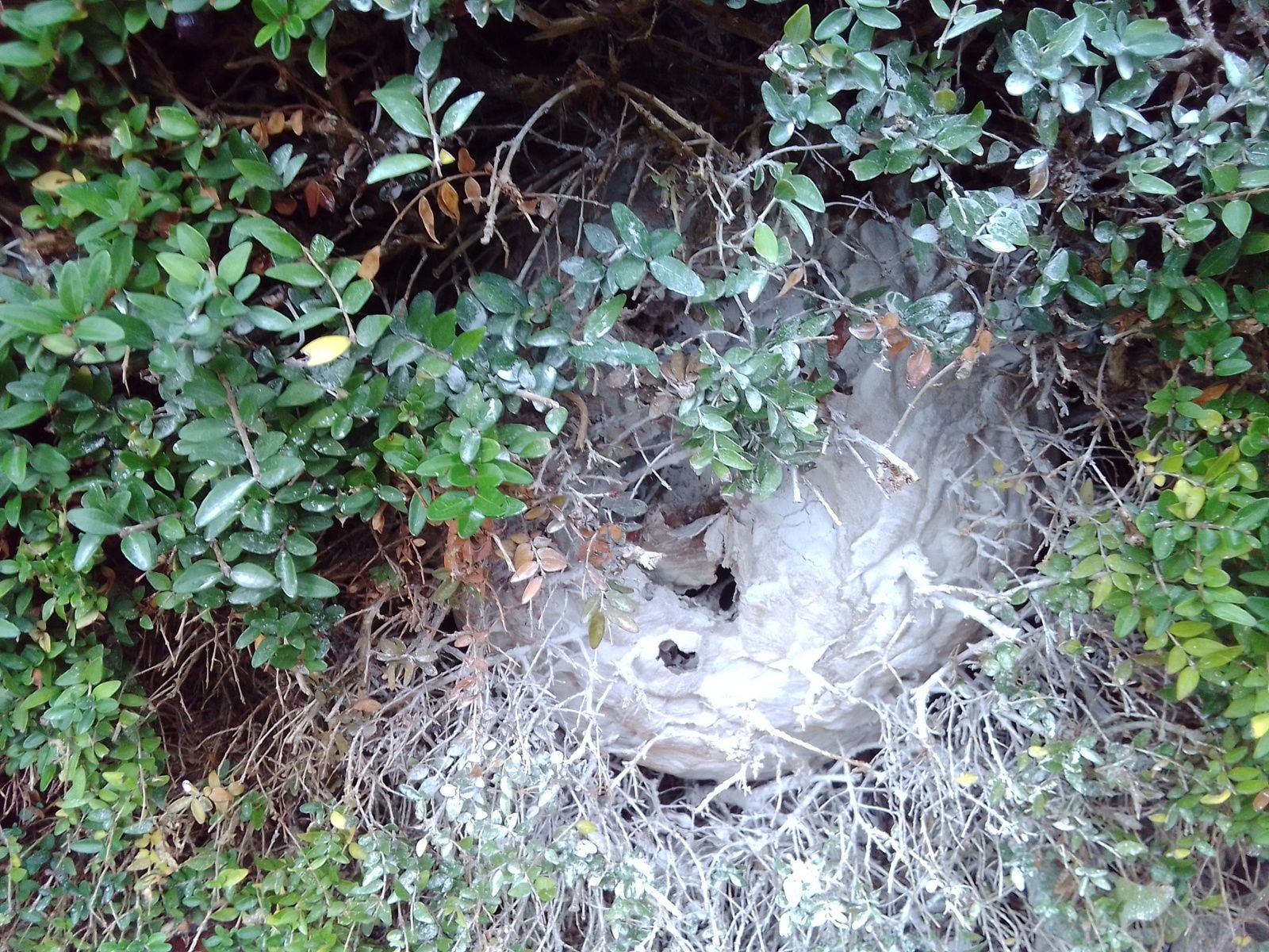 Moi qui croyais que les nids de frelons Asiatiques se trouvaient majoritairement sur la cime des arbres, je vous mets les photos d'un nid, découvert dans les espaces verts de notre résidence, à portée de truffe de nos loulous (toujours à sniffer quelque chose...) et des enfants ! Alors soyez vigilants, que ce soit dans votre jardin ou en balade, surveillez vos haies même basses, vos arbres, vos abris de jardin... tous les endroits peuvent être pris d'assaut par ces satanées bestioles ! Pour info également, il faut veiller à ne pas ramasser ou écraser un frelon asiatique, notamment en extérieur, même mort, il peut piquer avec son dard et injecter du venin, mais aussi libérer une substance odorante qui peut alerter ses congénères du danger !!!